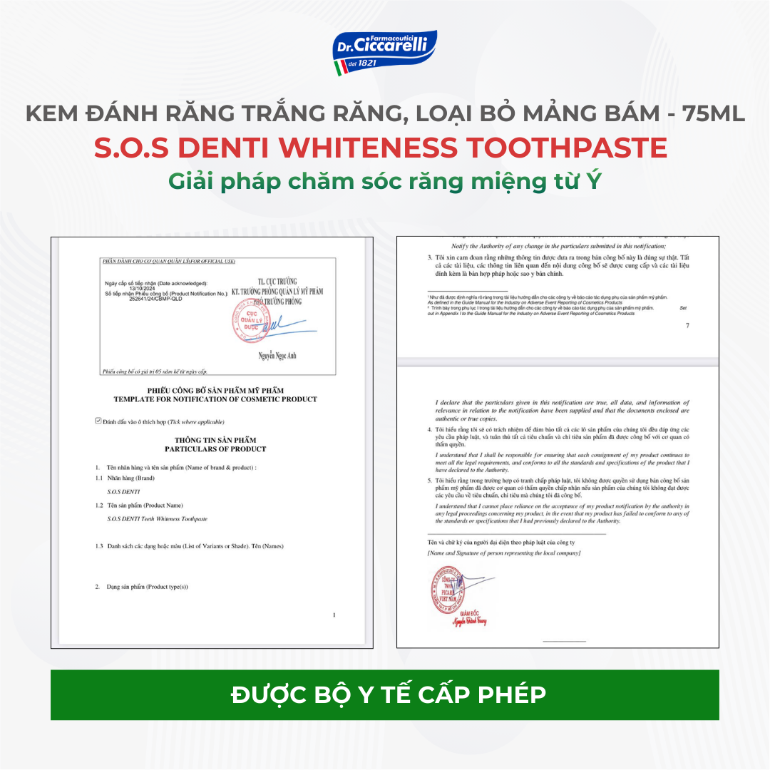 S.O.S Denti – Kem đánh răng loại bỏ mảng bám là sản phẩm chuyên biệt đến từ thương hiệu danh tiếng Dr.Ciccarelli, với gần 200 năm kinh nghiệm trong nghiên cứu và phát triển các giải pháp chăm sóc răng miệng chuyên sâu.