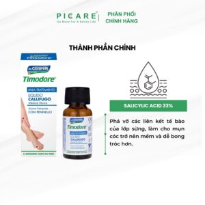 Dung dịch loại bỏ mụn cóc Timodore – Dr.Ciccarelli là sản phẩm điều trị chuyên biệt dành cho mụn cóc và vết chai lâu năm, đặc biệt hiệu quả với những vùng da thường xuyên bị áp lực như gan bàn chân hoặc ngón tay.