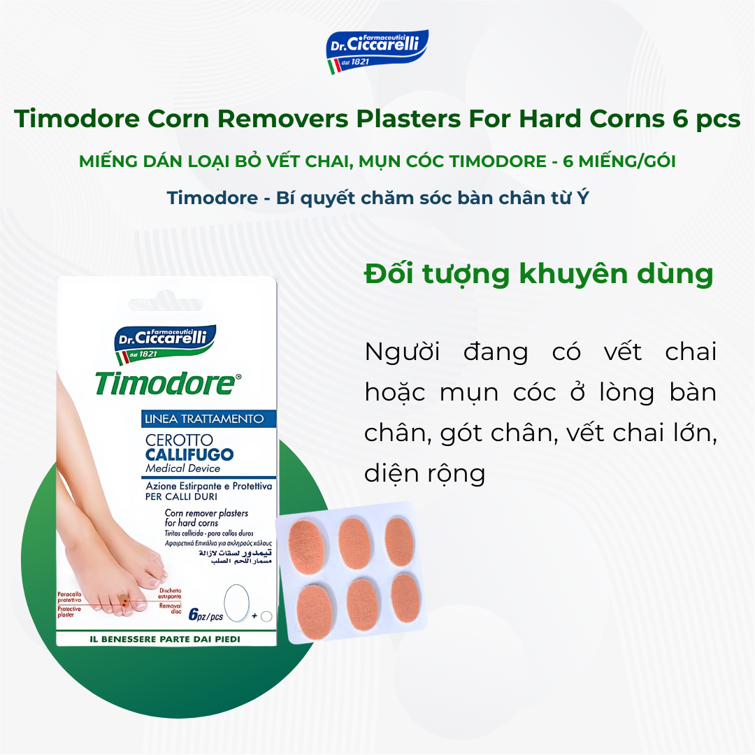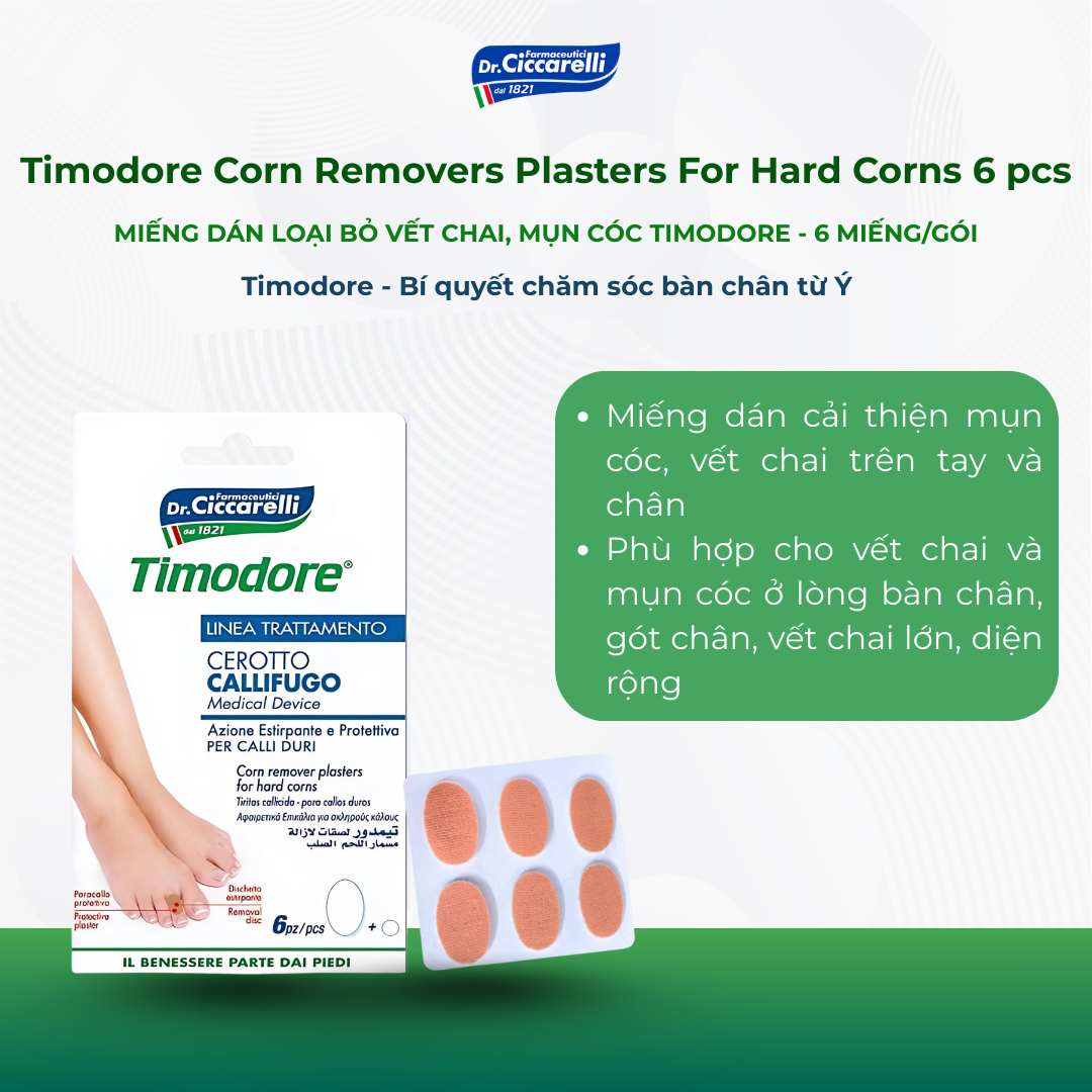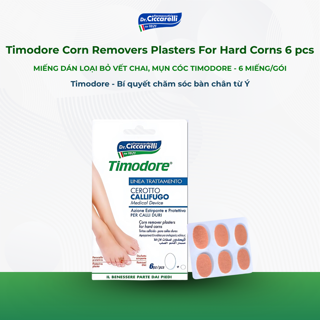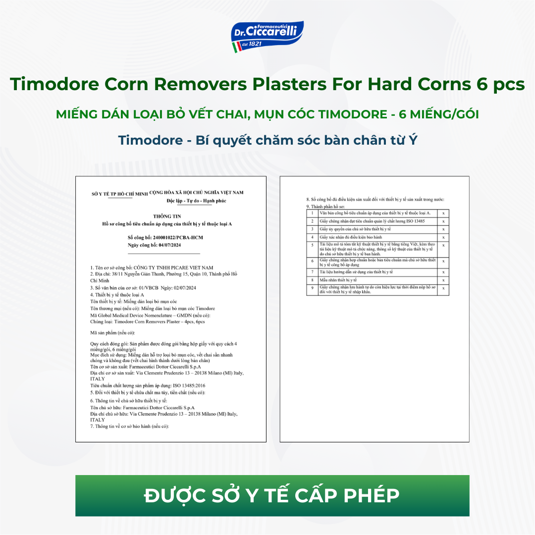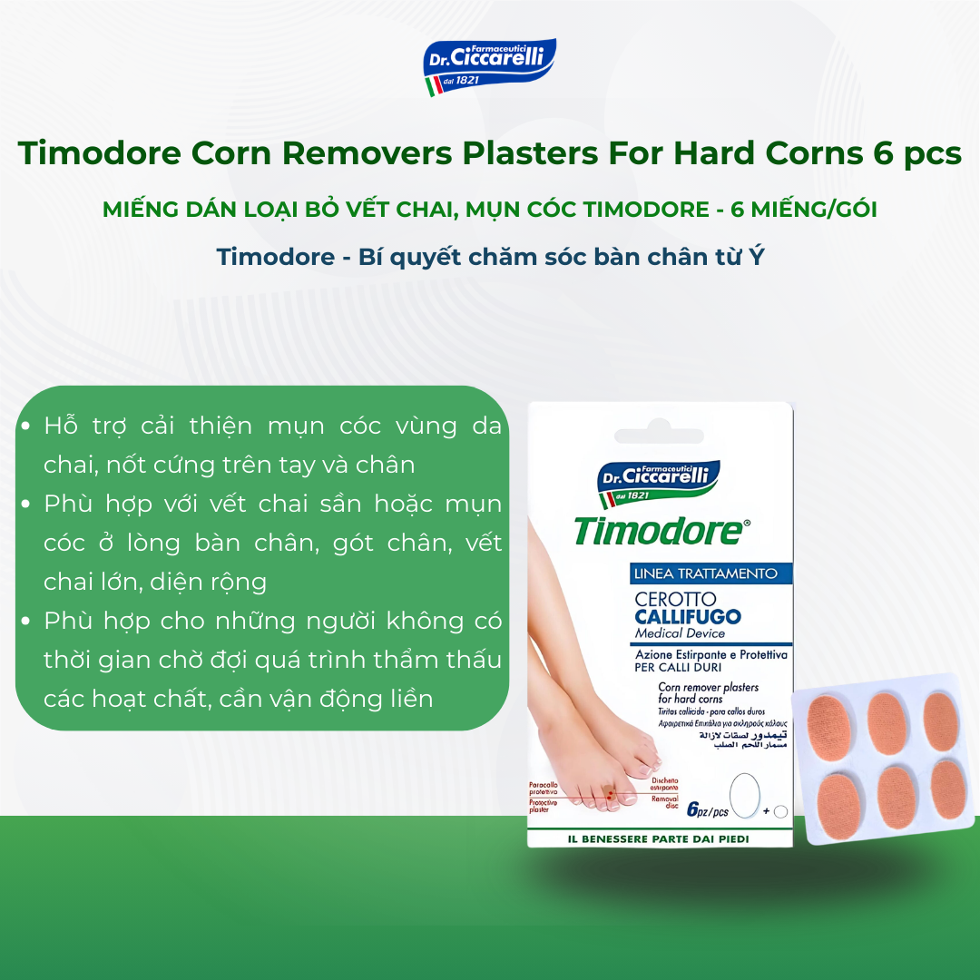 Miếng dán mụn cóc Timodore – Dr.Ciccarelli là giải pháp chuyên biệt giúp loại bỏ mụn cóc và vết chai hiệu quả, đặc biệt là ở vùng bàn chân – nơi thường xuyên chịu áp lực từ việc đi lại.
